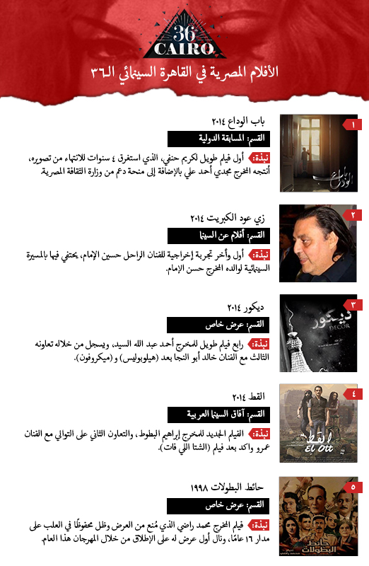 فيلم واحد في المسابقة الدولية، وآخر في قسم (أفاق السينما العربية)، وثالث في قسم (أفلام عن السينما)، باﻹضافة إلى عروض خاصة لفيلمان يعرضان للمرة اﻷولى، أحدهما من إنتاج هذا العام، واﻵخر من إنتاج عام 1998، لتكون حصيلة اﻷفلام المصرية المتواجدة في الدورة السادسة والثلاثون لـمهرجان القاهرة السينمائي الدولي خمسة أفلام، تتعرفون عليها عن طريق الانفوجراف التالي: