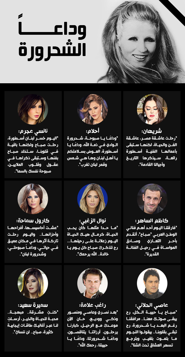 عقب انتشار خبر وفاة الشحرورة "صباح" فجر اليوم اﻷربعاء، سارع عدد كبير من نجوم الفن في الوطن العربي لنعي الراحلة، التي وصفها العديدون منهم بالأسطورة.