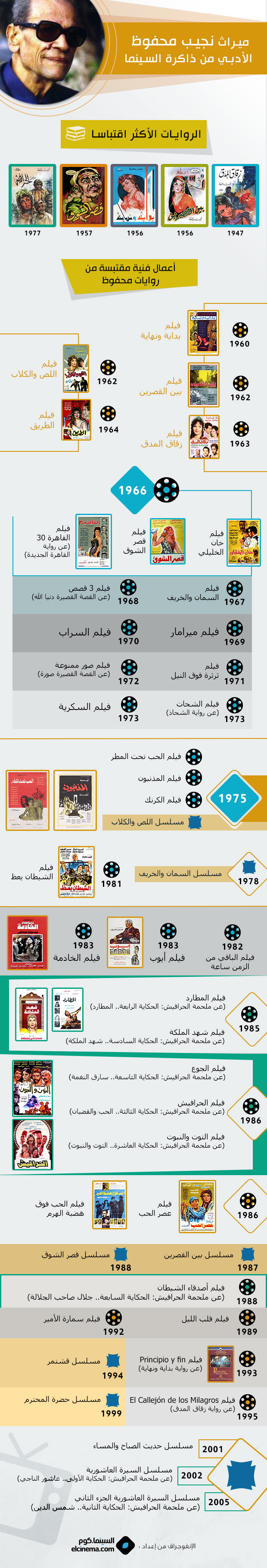 تحتفي السينما.كوم على طريقتها الخاصة بالراحل نجيب محفوظ في ذكرى وفاته بعرض إنفوجرافيك مجمع للأعمال السينمائية والتلفزيونية المقتبسة عن أعماله اﻷدبية.