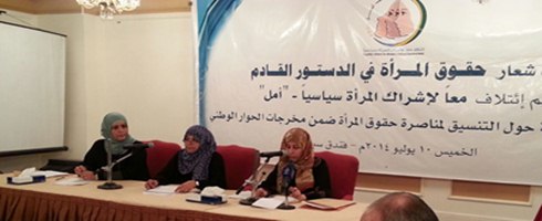 نفذ إئتلاف معاً لإشراك المرأة سياسياً – أمل- جلسة نقاشية حول مناصرة حقوق المرأة في الدستور القادم والقوانين والسياسات بحسب مخرجات الحوار الوطني في يوم الخميس الموافق 10 يوليو 2014. وتهدف هذه الجلسة لتنسيق الجهود الخاصة بمناصرة ودعم حقوق المرأة والتعرف على دور الحكومة والجهات المختصة في إستيعاب مخرجات الحوار الوطني ضمن برامجها.