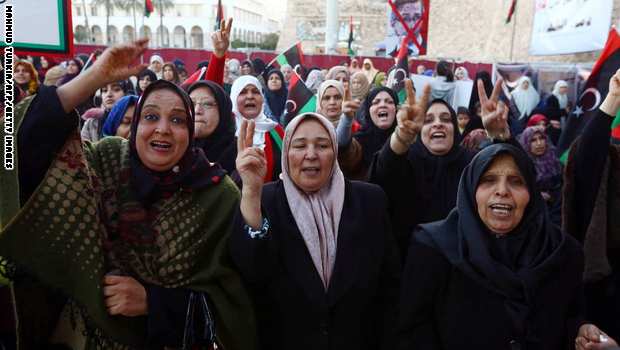 ونظمت العشرات من النساء الليبيات وقفات احتجاجية في الفترة الماضية في مدن مختلفة من البلاد، للمطالبه بزياده نسبة تمثيلهن في الحقل السياسي والدعوة إلى تكريس العدالة والمساواة بين الجميع ومبدأ تكافؤ الفرص بين الرجل والمرأة.