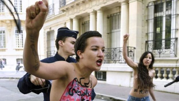 وفي مايو/ آيار تفاقم الوضع المتوتر عندما تظاهرت ثلاث ناشطات من منظمة فيمن الأوروبية عاريات خارج مبنى وزارة العدل التونسية، وتعرضن أيضا للإيقاف والسجن.