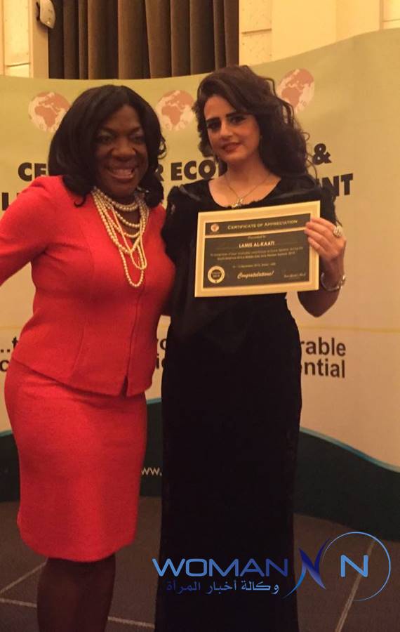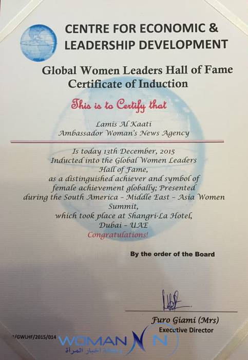 وفي السياق نفسه، تسلمت القاعاتي من النائبة دي داوكنز هيغلر رئيسة الجمعية التشريعية العامة لتجمع السود في ولاية جورجيا الأميركية شهادة تقدير كممثل لوكالة أخبار المرأة تثميناً لدور الوكالة في رعايتها الإعلامية لقمة نساء أميركا الجنوبية وأفريقيا والشرق الأوسط وآسيا 2015 التي انطلقت في دبي يوم 13 ديسمبر/كانون الأول، في حين تسلمت شهادة تقدير من مركز التنمية الإقتصادية وتطوير القيادات CELD الذي يعمل تحت إشراف الأمم المتحدة.