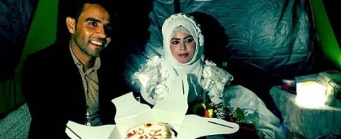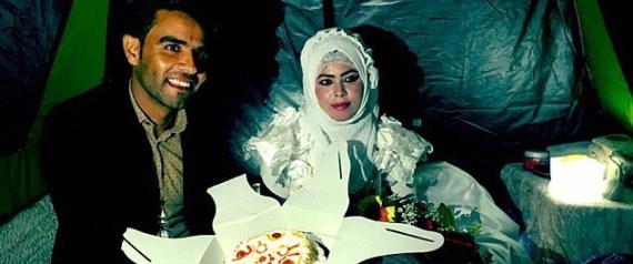 عمال الإغاثة الذين رتّبوا للحفل لم يغفلوا أيضاً بعض الزهور لتوضع على الفراش بالخيمة المُعدة للعروسين.
