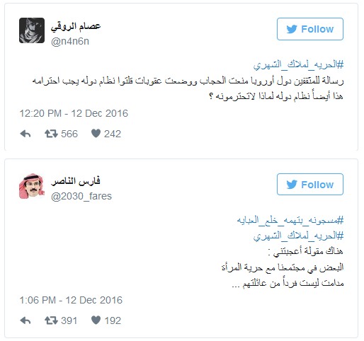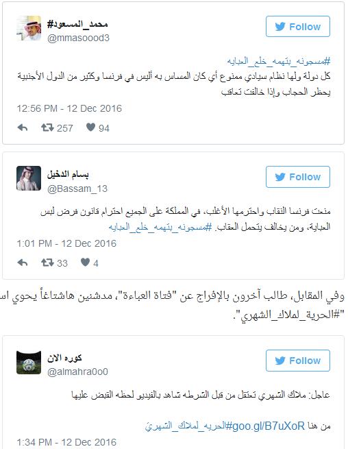 المغردون على الشبكات الاجتماعية في السعودية أطلقوا هاشتاغ " #مسجونه_بتهمه_خلع_العبايه "، معربين عن آرائهم تجاه القبض على "فتاة العباءة"، حيث يرى البعض أن فرنسا منعت النقاب وفرضت عقوبة للمخالفات، كذلك ارتداء العباءة هو أمر ملزم قانوناً في المملكة وعلى الجميع احترامه.