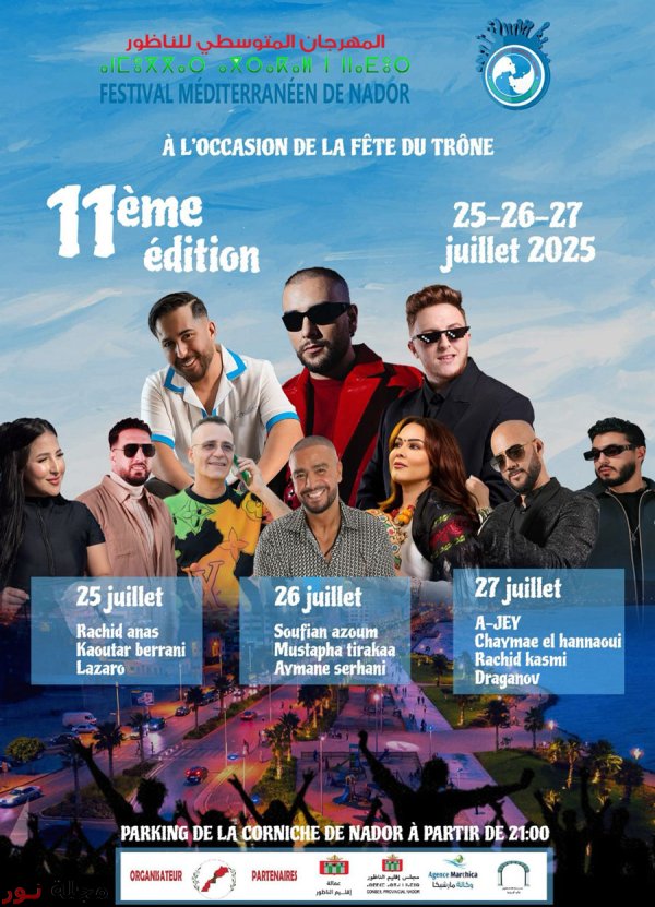 في إطار احتفالات الشعب المغربي بالذكرى 26 لعيد العرش المجيد، وسعياً لتخليد هذه المناسبة الحافلة بالدلالات والحمولات التاريخية التي تسلِّط الضوء على أواصر المحبة وتعلُّق الشعب المغربي الراسخ بجلالة الملك محمد السادس نصره الله باعتباره رمز الأمة وموحدها وباعث نهضتها وضامن أمنها وأمانها وتقدمها، وتزامناً مع عملية "مرحبا" التي تهم استقبال أفراد جاليتنا المغربية المقيمة بالخارج القادمة لزيارة بلدها وربط صلة الرحم بالأهل والأصدقاء، تعلن الجمعية المتوسطية للتنمية المستدامة بالناظور، بشراكة مع عمالة اقليم الناظور ومجلس اقليم الناظور، عن تنظيم الدورة الحادية عشر من المهرجان المتوسطي للناظور في الفترة ما بين 25 يوليو الجاري إلى غاية 27 منه، تحت شعار: "الناظور في لقاء مع العالم".