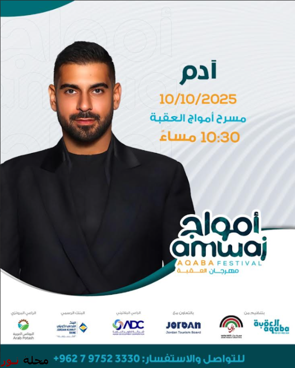 يحيي الفنان اللبناني " آدم " حفلاً غنائياً قريباً في العقبة، ضمن فعاليات " مهرجان أمواج العقبة "، مساء يوم الجمعة الموافق 10/10/2025، ومن المقرر أن يقدِّم آدم خلال الحفل باقة متميزة من أشهر أغنياته المحببة لدى جمهوره.