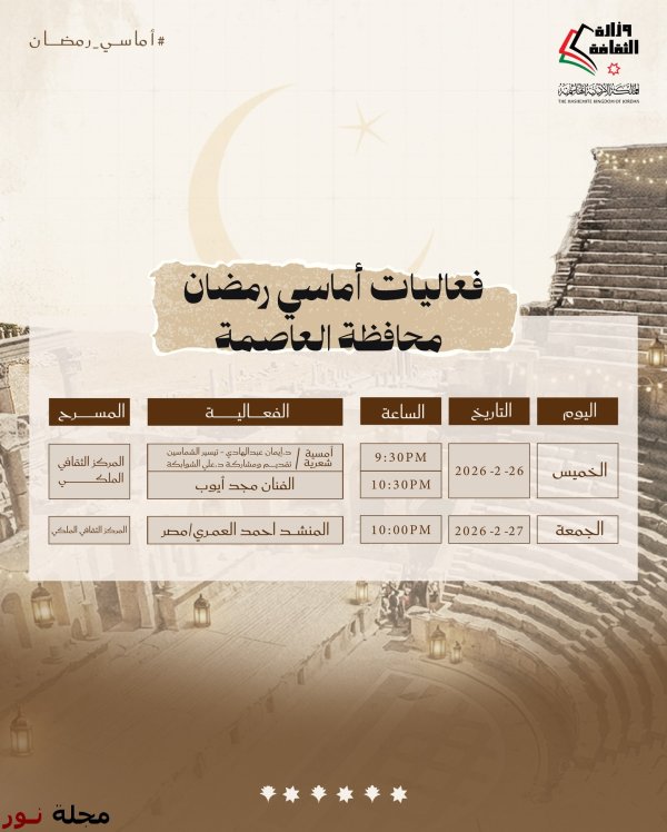يُحيي المنشد الديني أحمد العمري، أمسية إنشادية، اليوم الخميس عند الساعة العاشرة مساءً، في محافظة إربد، على مسرح مركز إربد الثقافي، وغداً الجمعة يحيي أمسية إنشادية في عمان بالمركز الثقافي الملكي ضمن فعاليات "أماسي رمضان " والذي تنظمه وزارة الثقافة بالتعاون مع مهرجان جرش.