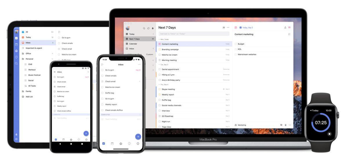 تتميز أداة TickTick بأنها متاحة لجميع الأجهزة، حيث يوجد منها إصدارات سطح المكتب لنظام التشغيل (ويندوز) Windows، و(ماك أو إس) macOS، وإصدار للويب، ومتاحة كإضافة لمتصفحات الويب.