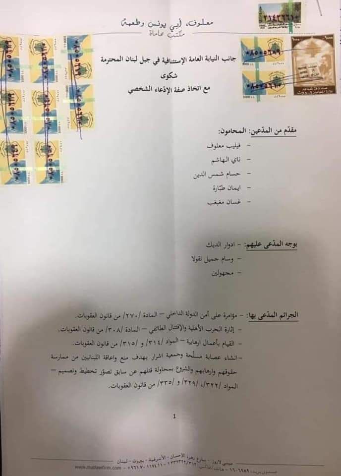 تقدّمت مجموعة من المحامين وهم: فيليب معلوف، ناي الهاشم، حسام شمسن الدين، إيمان طبّارة وغسان مغبغب، بشكوى قضائية لدى النيابة العامة الإستئنافية في جبل لبنان، بوجه المدعى عليهم: إدوار الديك، وسام جميل نقولا، ومجهولين، وذلك على خلفية الجرائم التالية: