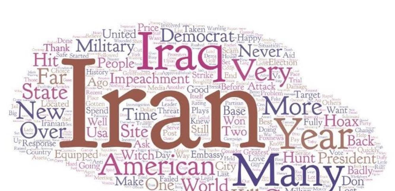 وكانت إيران الكلمة الأكثر تكرار في تغريدات ترامب بواقع 16 مرة، تلتها كلمتي العراق وأميركيين بواقع 9 مرات، أما كلمة العزل التي يفترض أنها تشغل بال الرئيس الأميركي، فلم ترد سوى 8 مرات، وفق أداة تحليل المضمون "ورد آرت".