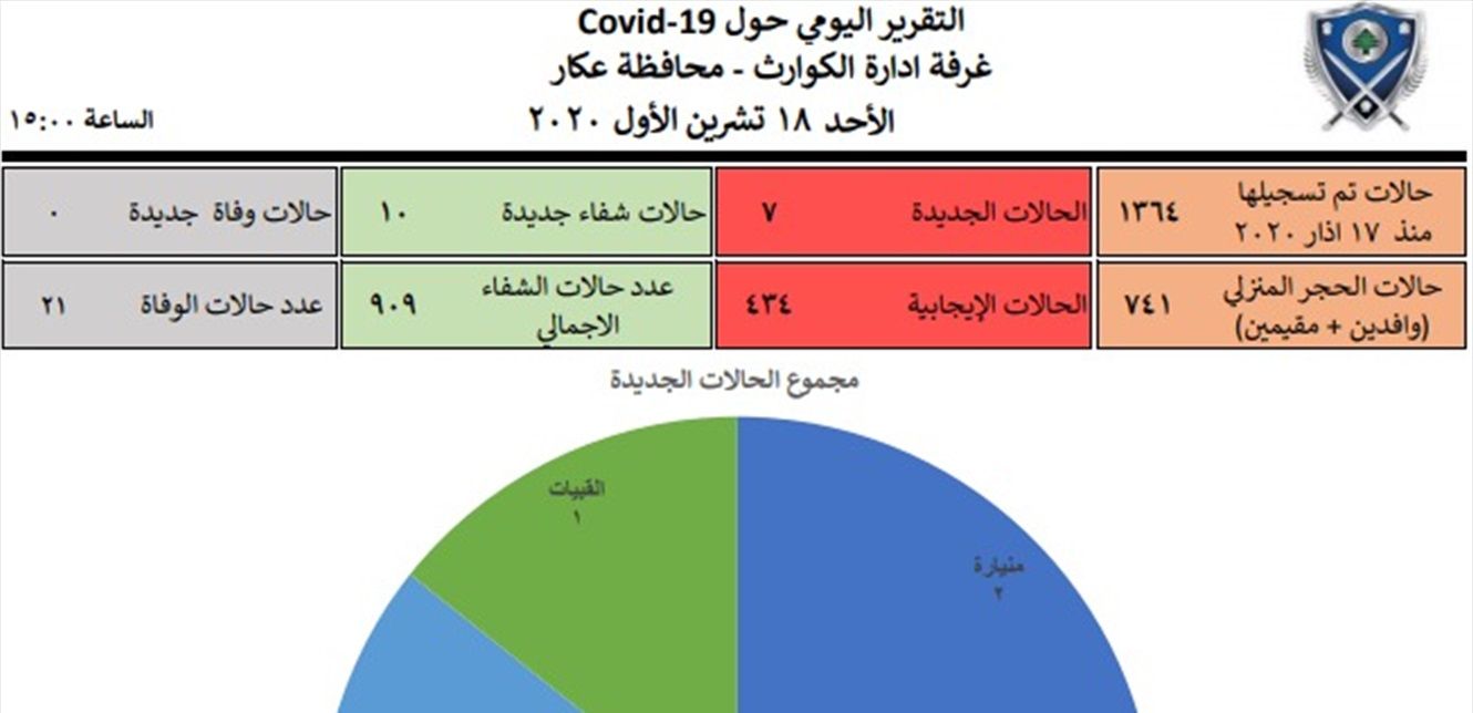 أفادت غرفة إدارة الكوارث في محافظة عكار في تقريرها اليوم، عن تسجيل 7 إصابات جديدة، ما رفع العدد التراكمي للمصابين في عكار منذ بدء الازمة وحتى اليوم، الى 1364 مصابا.