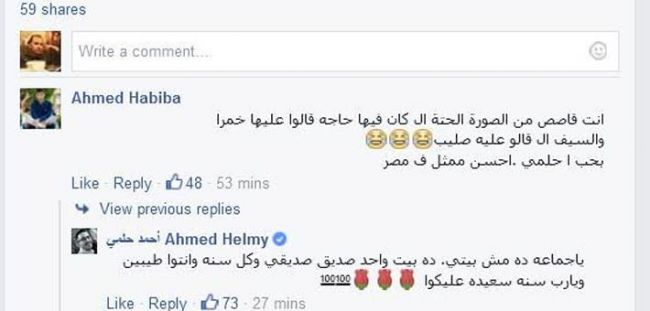 وما أن نشر حلمي الصورة علق عليها أحد محبيه ساخرا من منتقدي ممثله المفضل: "أنت قصصت من الصورة الجزء الذي ظهر به شيئ قالوا أنه خمر، والسيف الذي قالوا عليه صليب".