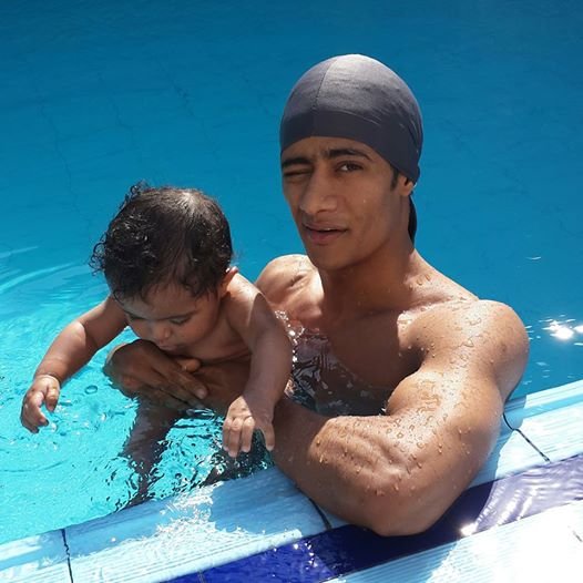 نشر الفنان الشاب محمد رمضان صورة تجمعه مع ابنه الصغير "على"، عبر حسابه الشخصى "فيس بوك"، وهو يحمله من داخل "حمام السباحة".