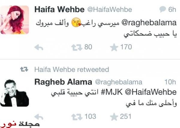 لترد " هيفاء " هي الأخرى على تغريدته و تعلّق : " ميرسي راغب و ألف مبروك يا حبيب ضحكاتي ".