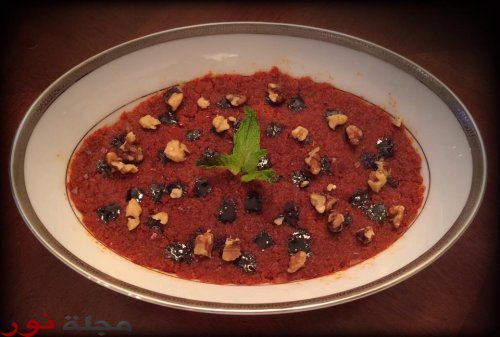 - تُسكب في صحن التقديم ثم تزيّن بدبس الرمان و الجوز و رؤوس النعناع.