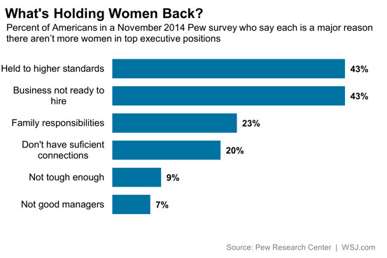 فـ80% من المستفتين صوّتوا أن النساء يسيّرنَ الأعمال بشكلٍ جيّد تماماً مثل الرجال، وأحياناً أفضل بما أنهنّ صادقات ويعاملن موظّفيهنّ بعدالة. لكن 43% صوّتوا أن ما يمنعهنّ الوصول إلى مراكز إدارية في مهنتهنّ هو النظرة غير العادلة إلى النساء في العمل، وتقييمهنّ بشكلٍ أقسى من الرجال.