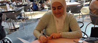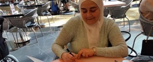 صورة تذكارية لسفيرة وكالة أخبار المرأة السيدة لميس القاعاتي مع الأديبة رامة عمر باشا الإدلبي