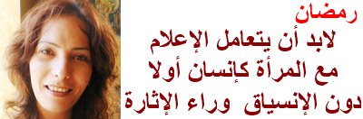 وشددت رمضان رعلى ضرورة توخّي الحيطة والحذر عند التناول الإعلامي لقضايا المرأة وعدم إبرازها كقطعة ديكور بجسدها الأنثوي، ولا كضحيّة في حال أخطأت، ومن المنطلق نفسه عدم التعامل معها كآلة للخطأ في مجتمع ذكوري. فالمرأة والرجل يتقاسمان الحياة، وعليه يجب التعامل معهما بالمنظور نفسه في الإعلام، كإنسان فاعل.
