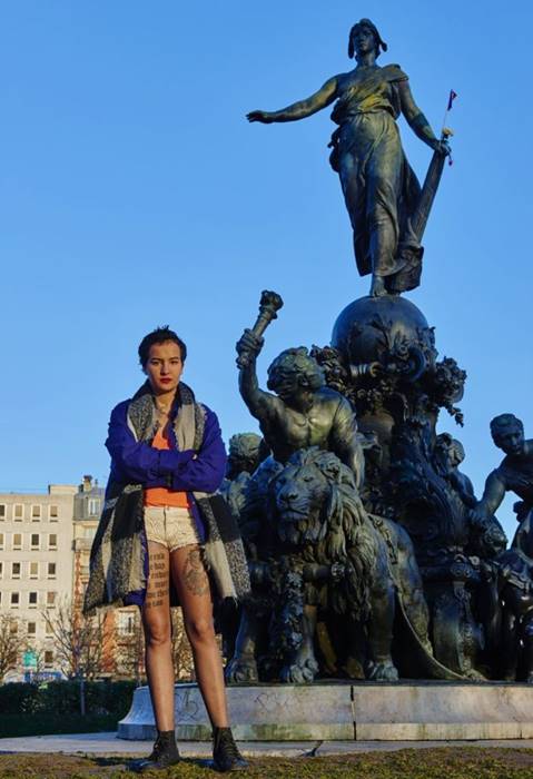 ووضعت أمينة أحمر الشفاه وكحلا أسود، وكانت عارية الصدر، وظهرت رسالة على نصفها العلوي باللغة العربية: "جسدي ملكي، وليس شرف أحد."