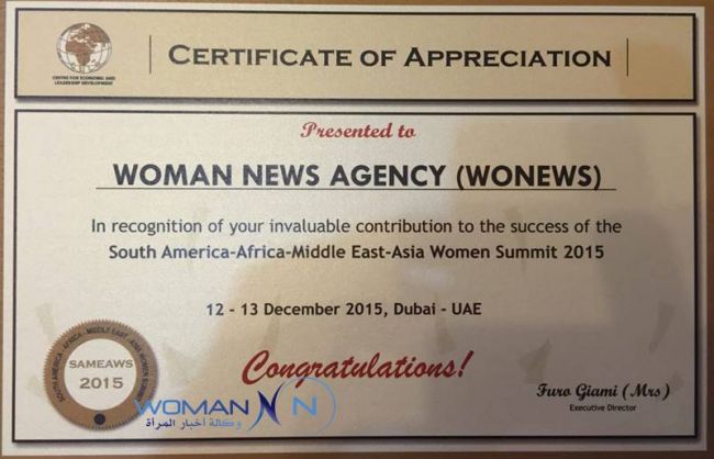 وفي السياق نفسه، تسلمت القاعاتي من النائبة دي داوكنز هيغلر رئيسة الجمعية التشريعية العامة لتجمع السود في ولاية جورجيا الأميركية شهادة تقدير كممثل لوكالة أخبار المرأة تثميناً لدور الوكالة في رعايتها الإعلامية لقمة نساء أميركا الجنوبية وأفريقيا والشرق الأوسط وآسيا 2015 التي انطلقت في دبي يوم 13 ديسمبر/كانون الأول، في حين تسلمت شهادة تقدير من مركز التنمية الإقتصادية وتطوير القيادات CELD الذي يعمل تحت إشراف الأمم المتحدة.
