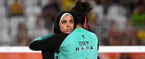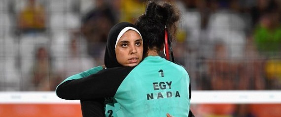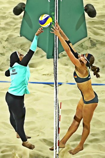 ندى معوض ودعاء الغباشي، لاعبتان في أول فريق نسائي مصري يشارك في الأولمبياد بكرة الشاطيء، إذ لبستا سترة رياضية بأكمام وبنطالاً طويلاً، كما ارتدت دعاء حجاباً على رأسها، وهو عكس ما اعتادت الرياضيات في هذه اللعبة ارتداءه، إذ تنص قواعد اللعبة على ارتداء البكيني كونه الأسهل في الوصول لأفضل أداء.
