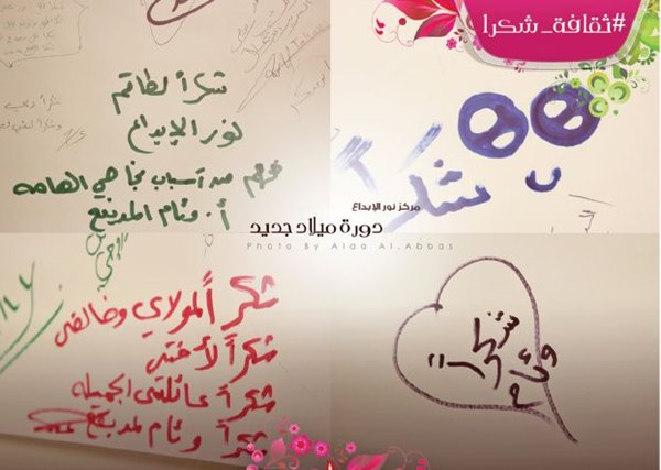 ودشّنت المديفع هذه الثقافة على أرض الواقع، عبر قطعة قماشية طولها 30 متراً، «عبر فيها كثيرون عما في دواخلهم، لمن يستحق أن يوجهوا له كلمة «شكراً»، موضحة أنه «خلال 3 أيام جمّع أكثر من 3 آلاف توقيع نسائي، فتلك أهدت شكرها لوالديها، وهذه لأختها، وتلك لصديقتها، ومنهن من قدمته لزوجها وأبنائها. ولم يغفل بعضهن من توجيه شكرهن لمعلمة كانت لها بصمة في مسيرتهن الدراسية».