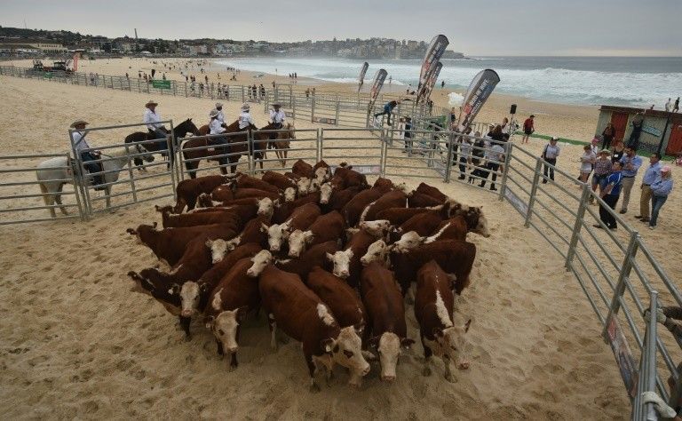 وجذب المنظر غير المألوف لاربعين بقرة قطعت الاف الكيلومترات من مناطق استراليا النائية فيما احاط بها ستة اشخاص على صهوة احصنة، مئات الفضولين على هذا الشاطئ المعروف برماله الناعمة.