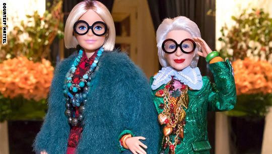 أصبحت أيقونة الموضة، آيريس آبفيل، البالغة من العمر 96 عاماً، أكبر امرأة في العالم تخلدها دمية باربي، لتنضم "نجمة المسنين" إلى قائمة طويلة من النساء المشهورات اللاتي صنعت لهن دمى باربي، أمثال جيجي حديد، وجي. كي. رولنغ، وميستي كوبلاند.