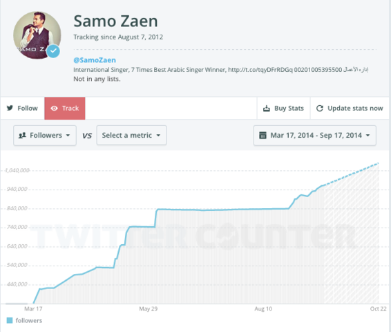 زاد عدد متابعي المطرب السوري على موقع تويتر للتواصل الاجتماعي "SamoZaen@" في الفترة بين ابريل ٢٠١٤ وسبتمبر ٢٠١٤ بنسبة غير منطقية تخطت ١٢٥٪ خلال ٥ شهور مقارنة بإجمالي عدد متابعيه في ابريل ٢٠١٤ (٤٢١ ألف متابع).