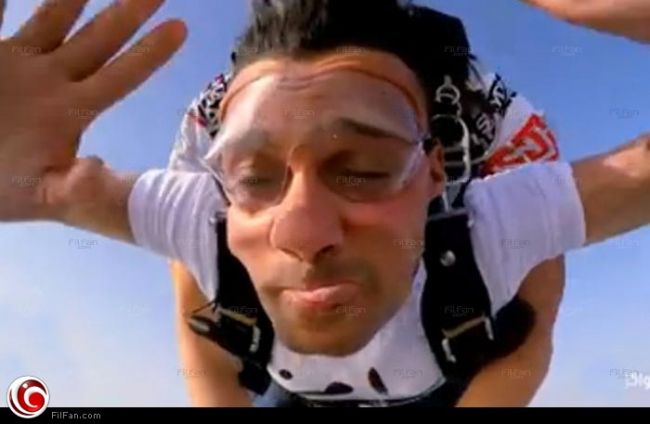 ويظهر رامز في آخر الفيديو وهو يلوح بيديه أثناء هبوطه بالمظلة من الطائرة.