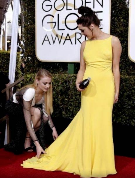 هذا ما حدث بين الممثلتين الشابتين صوفي ترنر ومايسي ويليامز، فترنر التقطت لها الكاميرات صورة وهي تساعد صديقتها على افتراش فستانها الأصفر الطويل على الأرض ليظهر شكله وقصته أمام الكاميرات.