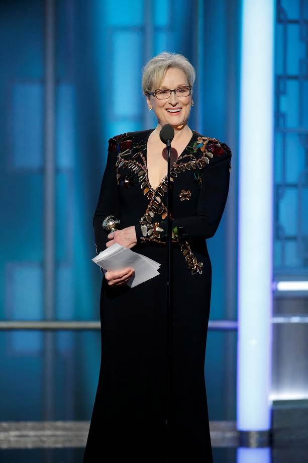 قالت ميريل ستريب في كلمتها بعد استلام جائزتها من الممثلة فيولا دافيس: "شكرا شكرا لكم، فقدت صوتي طيلة الأسبوع الماضي في الصراخ، وفقدت عقلي قبل ذلك بفترة، لذلم اسمحوا لي أن اقرأ كلمتي من الورق".