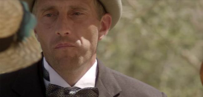 المشهد عبارة عن رجل أجنبي، يشبه فان جوخ كثيراً في ملامحه وملابسه، بينما يظلل عليه بالشمسية طفل أسمر صغير يعاني هو من أشعة الشمس. من بعيد يرقبهما الضابط محمود عبد الظاهر.