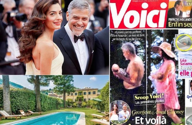 و نشرت مجلة Voici الفرنسية في عددها الصادر أمس الجمعة صورة لـ كلوني وزوجته أمل علم الدين بملابس السباحة وكل منهما يحمل أحد التوأمين أثناء قضاؤهما عطلة قرب بحيرة كومو الإيطالية وعلقت المجلة على الصورة "أول صورة لإيلا والكسندر" حسبما ذكرت صحيفة Mirror البريطانية.