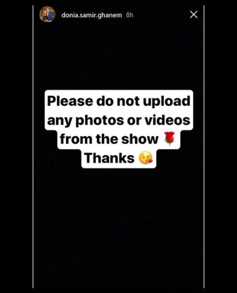 وعبر حسابها في موقع Instagram كتبت دنيا لجمهورها "رجاء لا ترفعوا أي فيديو أو صور من العرض".