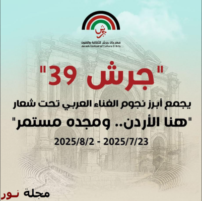 تحت الرعاية الملكية السامية، تنطلق الأربعاء 23 تموز المقبل، فعاليات الدورة (39) لمهرجان جرش للثقافة والفنون التي تستمر حتى 2 آب المقبل، وتحمل هذا العام شعار"هنا الأردن.. ومجده مستمر".