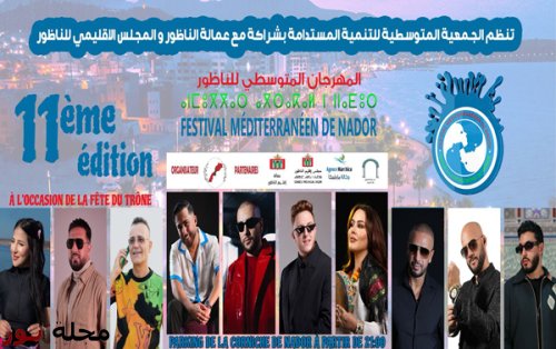 في إطار احتفالات الشعب المغربي بالذكرى 26 لعيد العرش المجيد، وسعياً لتخليد هذه المناسبة الحافلة بالدلالات والحمولات التاريخية التي تسلِّط الضوء على أواصر المحبة وتعلُّق الشعب المغربي الراسخ بجلالة الملك محمد السادس نصره الله باعتباره رمز الأمة وموحدها وباعث نهضتها وضامن أمنها وأمانها وتقدمها، وتزامناً مع عملية "مرحبا" التي تهم استقبال أفراد جاليتنا المغربية المقيمة بالخارج القادمة لزيارة بلدها وربط صلة الرحم بالأهل والأصدقاء، تعلن الجمعية المتوسطية للتنمية المستدامة بالناظور، بشراكة مع عمالة اقليم الناظور ومجلس اقليم الناظور، عن تنظيم الدورة الحادية عشر من المهرجان المتوسطي للناظور في الفترة ما بين 25 يوليو الجاري إلى غاية 27 منه، تحت شعار: "الناظور في لقاء مع العالم".