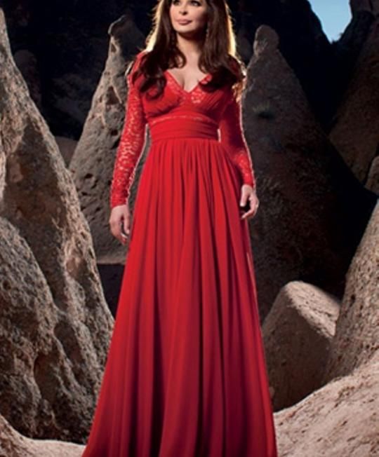 كعادة الفنانة اللبنانية هيفاء وهبي بخروجها عن المألوف، اختارت فستانًا طويلًا، بـأكمام طويلة، وفتحة طويلة من جنب واحد من الشيفون، مع تطريزات بالخرز البارز والدانتيل الشفاف على التوب العلوي.