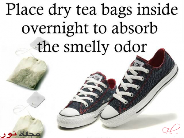 إذا كنت تعانين من روائح الثياب المعلّقة في الخزانة، أو الأحذية ذات رائحة كريهة، أكياس الشاي هي أنسب حلّ. علّقي أكياس الشاي المستعملة في زاوية من خزانة الملابس أو ضعيها داخل الأحذية ذات الرائحة الكريهة.