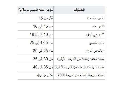 جدول يبين العلاقة بين مؤشر كتلة الجسم والوزن: