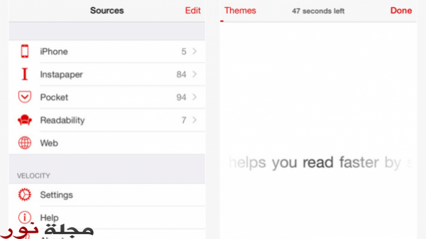 تطبيق Accelerator المتوفر لأجهزة آبل العاملة بنظام تشغيل iOS جاء ليقدم وسيلة قد تكون مفيدة و عملية بالنسبة للبعض، فهو يقوم على تحويل المقالات و الأخبار التي قام المستخدم بوضعها على لائحة مهامه من أجل قراءتها إلى كلمات تظهر بشكلٍ متتالي، بحيث يقوم التطبيق بتحويل المقال إلى كلمات تظهر الواحدة تلو الأخرى بشكلٍ سريع.