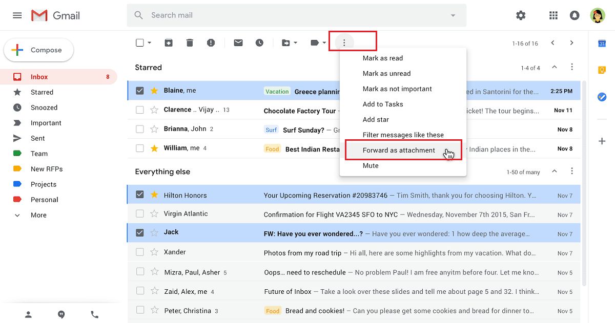 بمجرد ظهور خيار (إعادة التوجيه كمرفق) Forward as attachment في قائمة المزيد من الخيارات كما ذكرنا أعلاه، يمكنك اتباع الخطوات التالية: