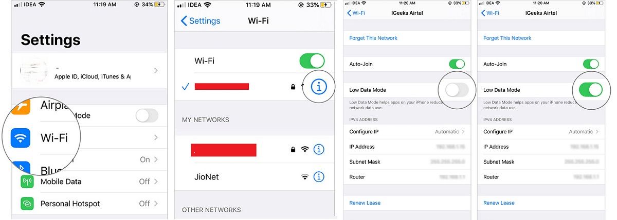 - في شاشة إعدادات شبكة Wi-Fi، قم بتشغيل (وضع تقليل استهلاك البيانات) Low Data Mode من خلال الضغط على زر التمرير المجاور له.