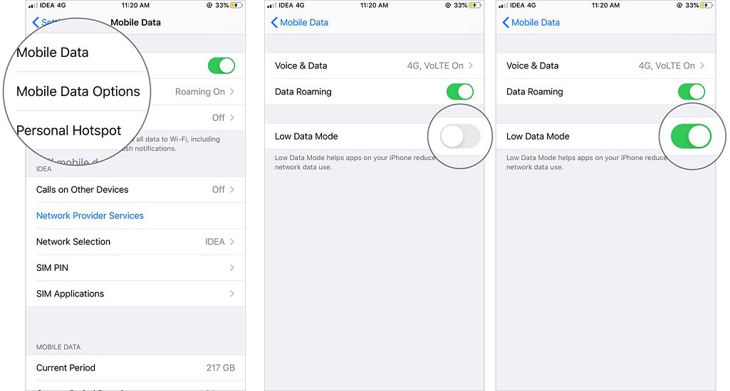 تعمل ميزة (وضع تقليل استهلاك البيانات) Low Data Mod، على تقليل استهلاك البيانات التي تستخدمها التطبيقات التي تعمل في الخلفية، ويتضمن ذلك: نسخ الصور احتياطيًا على (آي كلاود) iCloud، والتحديثات التلقائية للتطبيقات، وتشغيل الفيديو التلقائي.