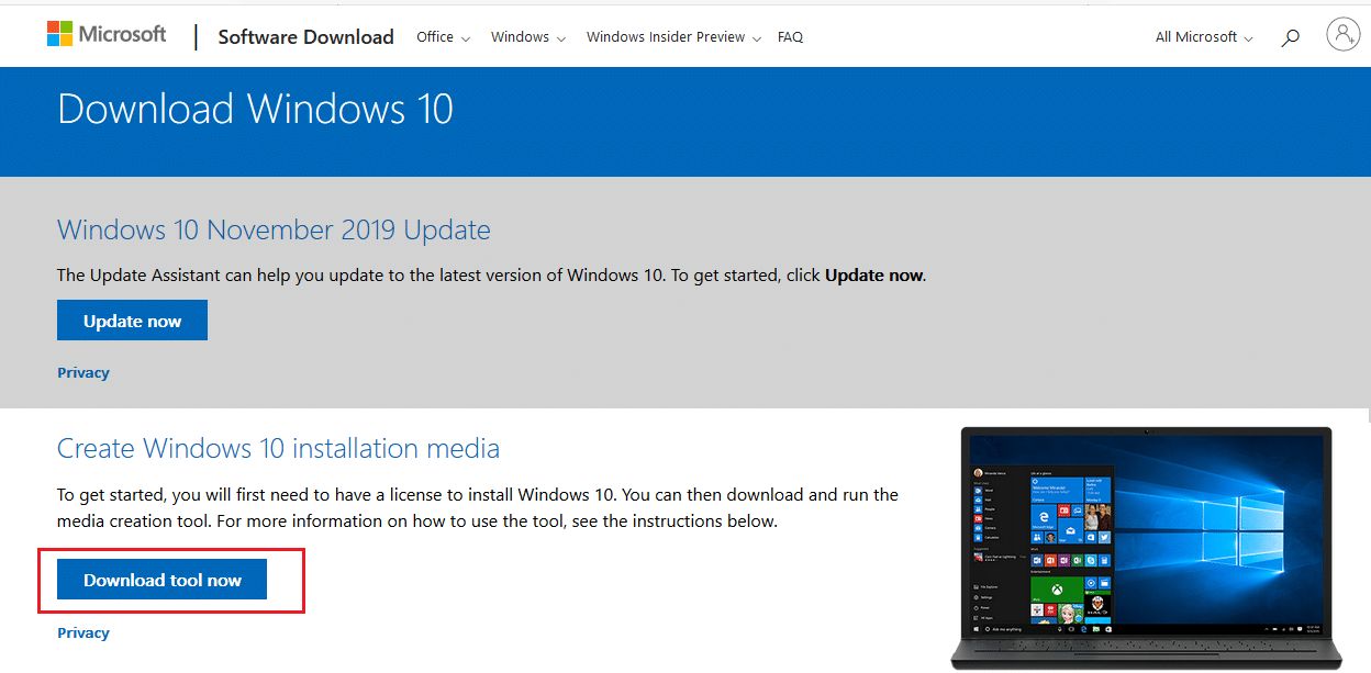 - تحت قسم (إنشاء وسائط تثبيت ويندوز 10) Create Windows 10 installation media؛ اضغط على خيار (تنزيل الأداة الآن) Download tool now.