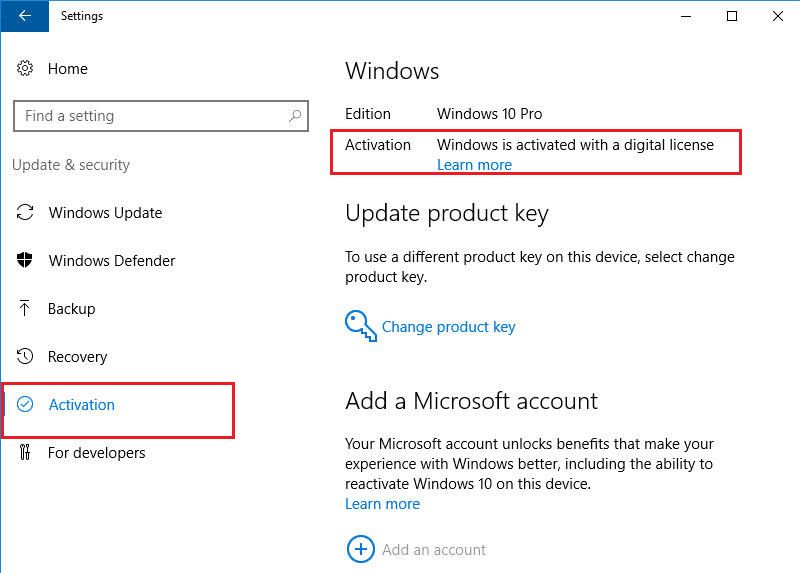- بمجرد اكتمال الترقية؛ وتوصيل الإنترنت ستحصل على ترخيص رقمي لنظام التشغيل ويندوز 10، والذي يمكنك تأكيده من خلال الانتقال إلى (الإعدادات) Settings، ثم (التحديث والأمان) Update & Security، ثم (التنشيط) Activation.