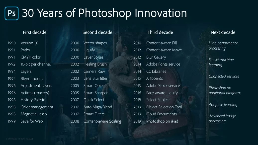 أطلقت شركة (أدوبي) Adobe في 19 شباط/ فبراير 1990 تطبيق تحرير الصور (فوتوشوب) Photoshop لأول مرة، وهي اليوم تحتفل بمرور 30 عامًا على إطلاقه بتقديم العديد من المزايا الجديدة للتطبيق.