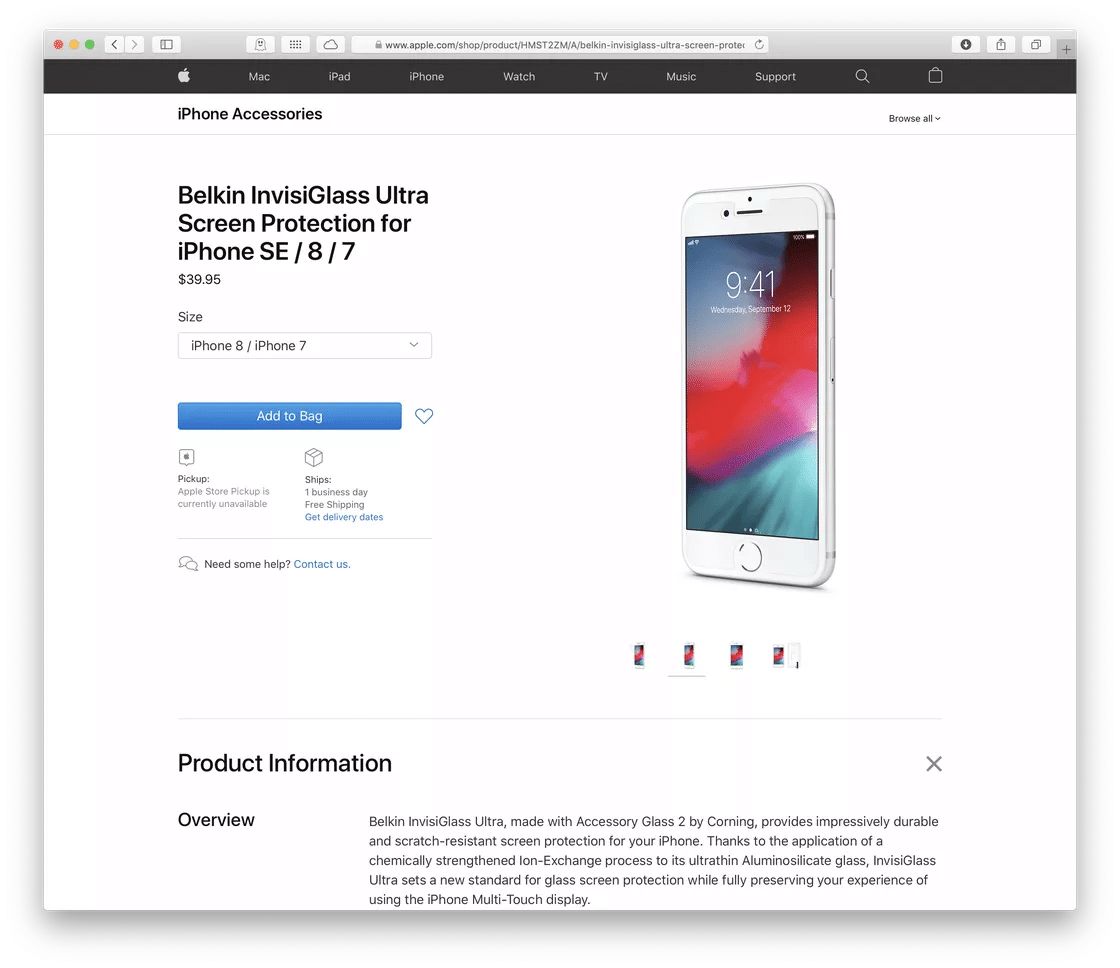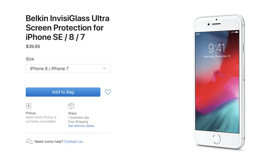وبعد التقارير التي كشفت عن ورود اسم الهاتف في صفحة زجاج الحماية من Belkin – المتاحة حاليًا للبيع بسعر 39.95 دولارًا أمريكيًا – أزالت آبل اسم (آيفون إس إي) من الصفحة. مع الإشارة إلى أن زجاج الحماية متاح أيضًا بقياس 5.5 بوصات، ولكنه مخصص لهاتفي (آيفون 7 بلس)، و(آيفون 8 بلس).