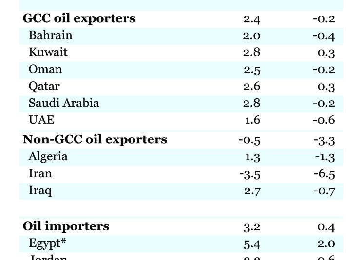 وفقاً لتلك المعطيات، قام معهد التمويل الدولي بخفض توقعاته للنمو في المملكة العربية السعودية من 2.8 في المئة إلى انكماش بنسبة 0.3 في المئة، كما رجّح تفاقم الركود في الجزائر، العراق وإيران. وتوقّع كبير الاقتصاديين في المعهد غربيس إيراديان، الذي أعدّ التقرير، ان ينكمش الناتج المحلي الإجمالي الحقيقي غير النفطي لدولة الإمارات العربية المتحدة بنسبة 0.6 في المئة، لافتاً الى انّ الزيادة المتواضعة في إنتاج السعودية والإمارات من النفط، قد تؤدي الى ارتفاع في نِسَب النمو. وقال معهد التمويل الدولي، انّ نشاط قطاع الخدمات سيتلقّى الضربة الأقسى، نتيجة جهود احتواء «الكورونا» والتباعد الاجتماعي.